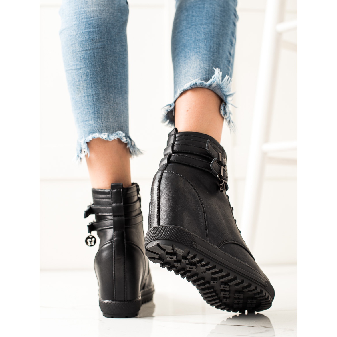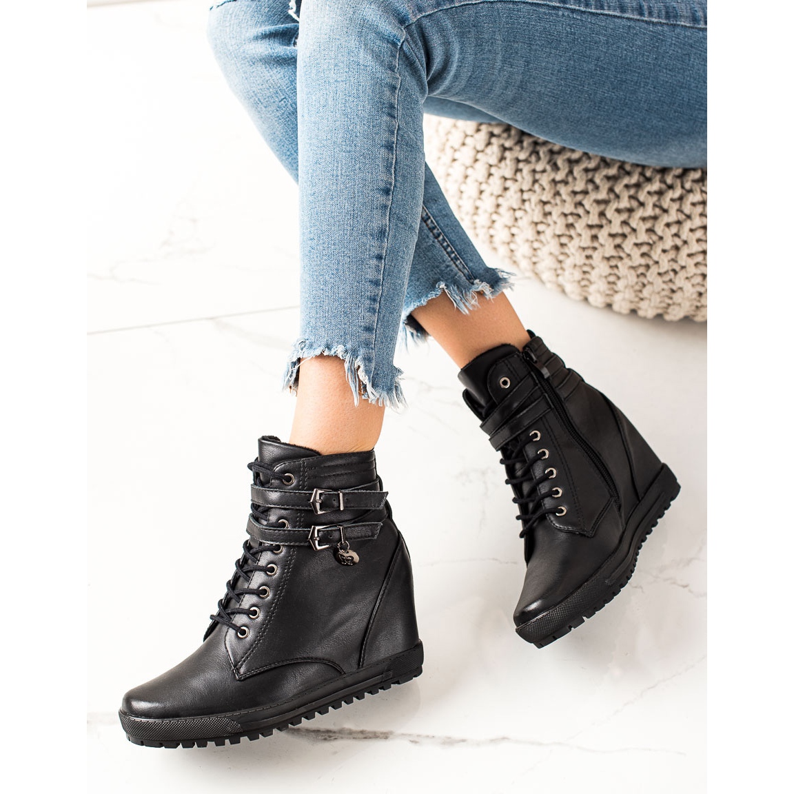 Die Stiefel sind aus hochwertigem ökologischem Leder gefertigt, was nicht nur für einen stilvollen Look, sondern auch für Langlebigkeit sorgt. Die Kunststoffsohle mit Profil garantiert hervorragenden Halt, was besonders an regnerischen oder winterlichen Tagen wichtig ist. Der versteckte 7 cm hohe Keilabsatz und das 2,5 cm hohe Plateau sorgen für dezente Eleganz, betonen jedes Styling und sorgen gleichzeitig für Tragekomfort.