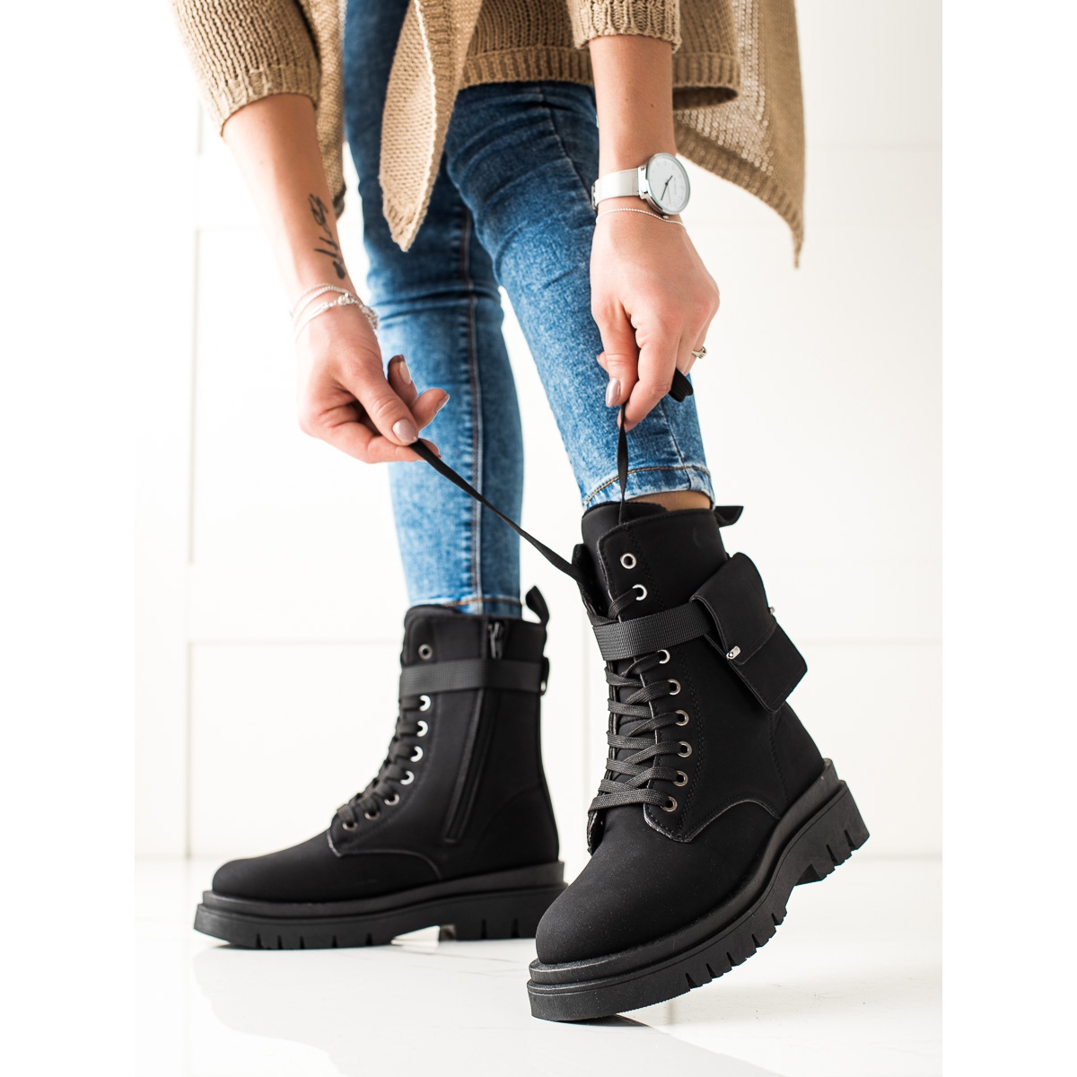 Entdecken Sie außergewöhnlichen Stil und Komfort mit TRENDI-Stiefeletten, die die perfekte Kombination aus Funktionalität und modernem Design darstellen. Diese schwarzen Schnürsneaker sind die perfekte Wahl für Herbst- und Wintertage und kombinieren einen lässigen Look mit praktischen Details.