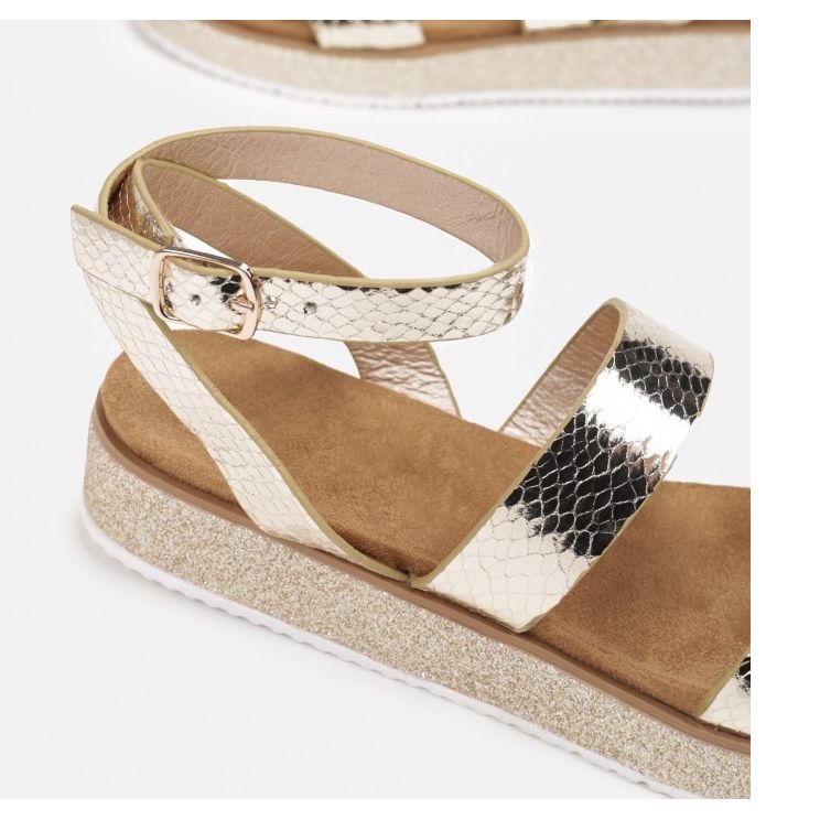 Die Sandalen zeichnen sich durch ein auffälliges Glitzer-Finish aus, das alle Blicke auf sich zieht und jedem Styling Glanz verleiht. Zierstreifen mit Glanz und Prägung verleihen ihnen einen einzigartigen Charakter. Für Tragekomfort sorgt zusätzlich die Knöchelschnalle, mit der Sie die Sandalen perfekt an Ihren Fuß anpassen können.