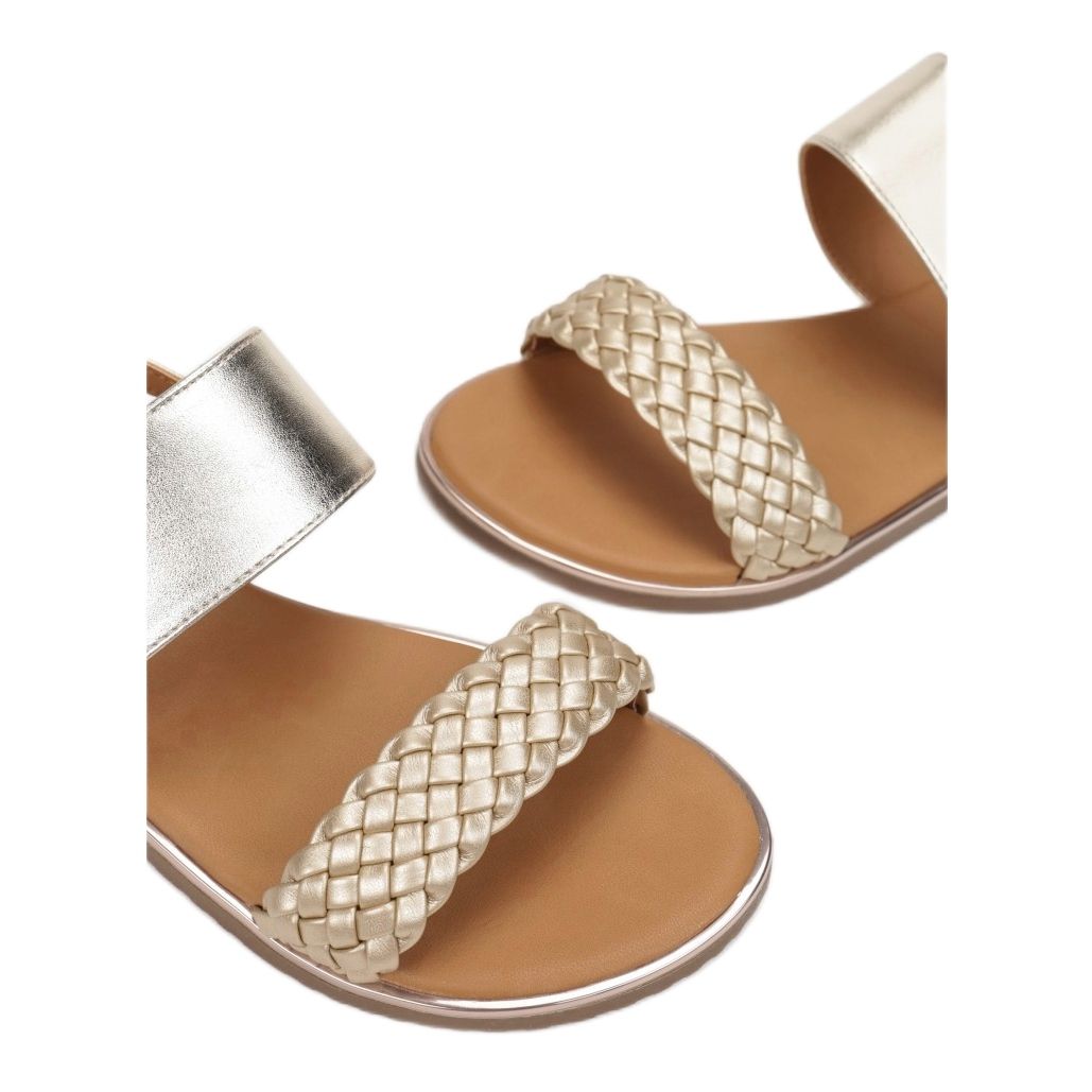 Die aus hochwertigem ökologischem Leder gefertigten Sandalen haben ein metallisches Finish, das ins Auge fällt und gut zu verschiedenen Kleidungsfarben passt. Ein flacher 1,0 cm hoher Absatz sorgt für maximalen Tragekomfort den ganzen Tag, und der Verzicht auf eine Spitze sorgt für Leichtigkeit.