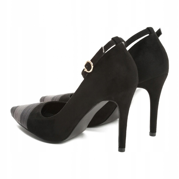 Die schwarzen Pumps zeichnen sich durch eine stark abgerundete, spitze Spitze und einen eingearbeiteten Absatz aus, was ihnen einen einzigartigen Charme verleiht. Ein dünner Riemen mit Verschluss sorgt nicht nur für Stabilität, sondern betont auch die Feinheit des Fußes. Bemerkenswert sind auch die Ergänzungen in Form von grauen Streifen an den Zehen, die den Schuhen einen einzigartigen Charakter verleihen.