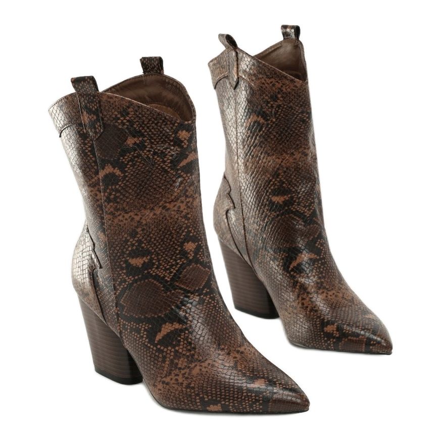 Die Stiefel bestehen aus hochwertigem Faux-Wildleder, das Schlangenhaut imitiert, und verfügen über ein Tiermuster, das jedem Styling Charakter verleiht. Die Innenseite der Schuhe ist leicht mit Kunstfell isoliert, was für Wärme an kälteren Tagen sorgt. Die spitze Spitze und der konische Absatz mit einer Höhe von 8 cm sorgen für eine schlanke Figur und machen sie nicht nur bequem, sondern auch äußerst feminin.