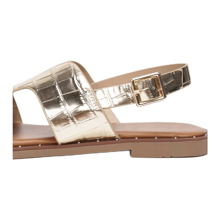 Diese klassischen flachen Sandalen verfügen über einen Schnallenverschluss über der Ferse für eine perfekte Passform und angenehmen Tragekomfort. Offene Zehen, Absätze und Seiten machen sie perfekt für warme Tage und der metallische Goldton verleiht jedem Styling Glanz.