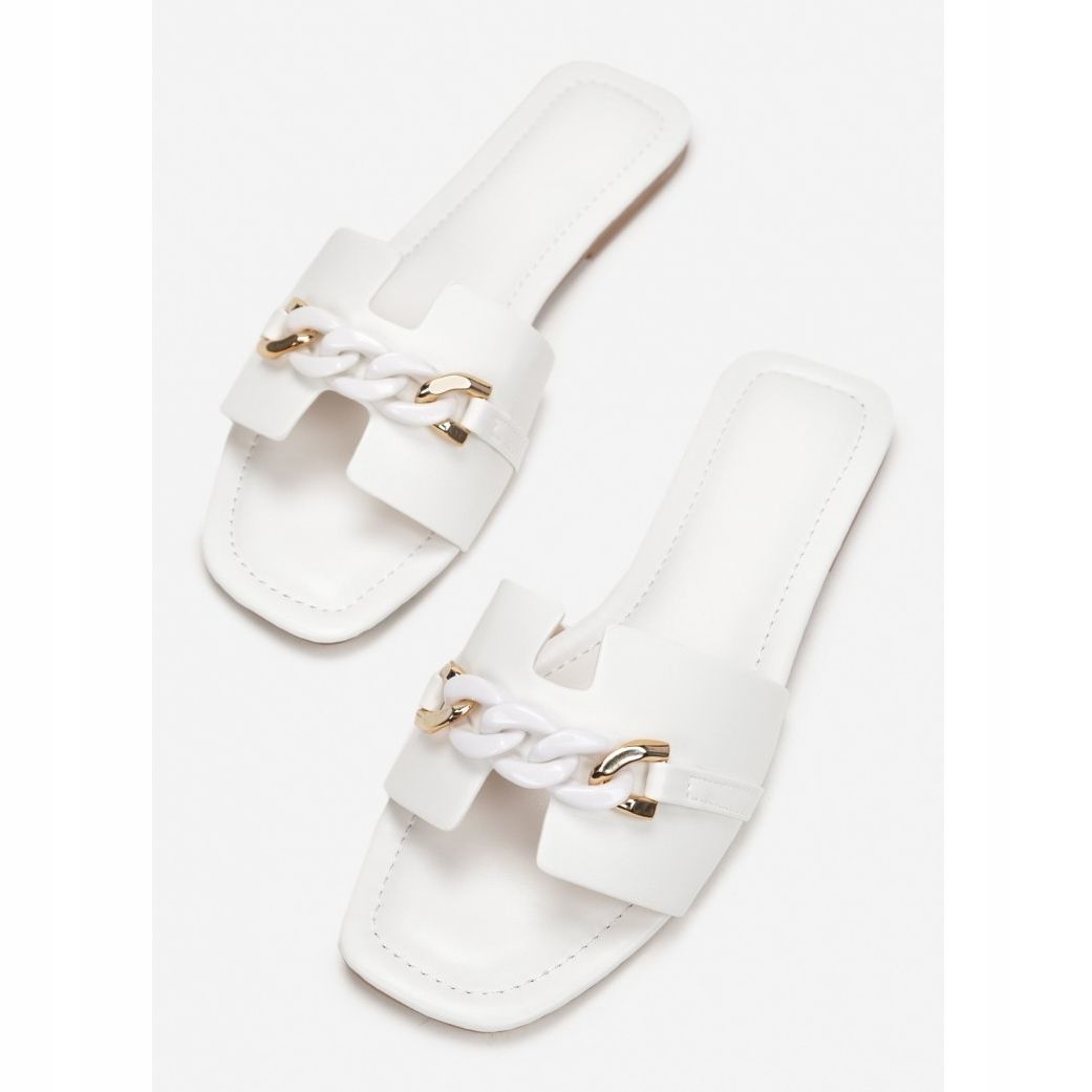 Die zehenstegsandalen Vices 2136-71 in elegantem Weiß sind die perfekte Wahl für jede Frau, die jeden Tag Komfort und Stil sucht. Diese Slip-On-Pantoletten zeichnen sich durch eine offene, quadratische Spitze aus, die ihnen einen modernen Look verleiht. Ein breiter Riemen an den Zehen, verziert mit einer auffälligen Kette in passender Farbe, verleiht Charakter und macht die zehenstegsandalen nicht nur bequem, sondern auch modisch.