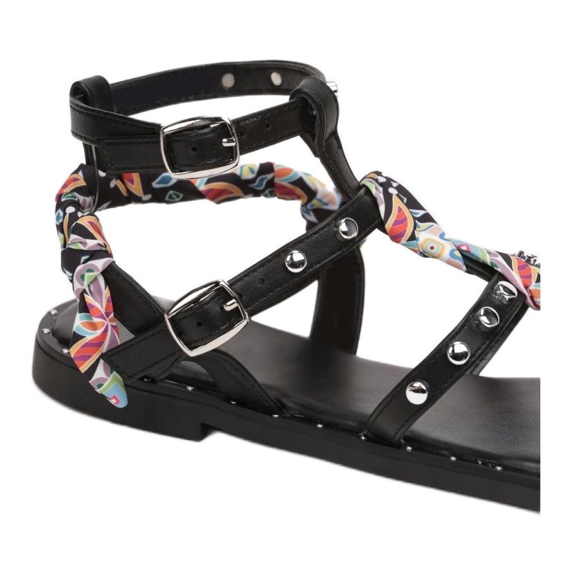 Die aus hochwertigen Materialien gefertigten Sandalen verfügen über eine synthetische Sohle, die für Langlebigkeit und Tragekomfort sorgt. Ökologisches Leder in der Innensohle sorgt für Komfort bei längerem Tragen. Darüber hinaus ist ihr originelles Design mit dezenten Strasssteinen und Nieten bereichert, die ihnen einen einzigartigen Charakter verleihen und perfekt zu aktuellen Trends passen.