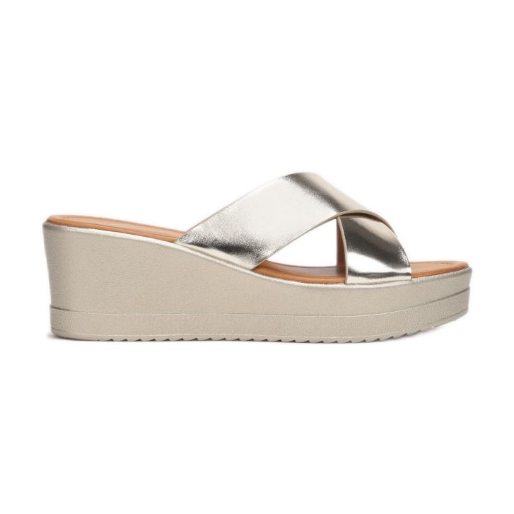 Entdecken Sie einzigartigen Stil und Komfort mit den Vices MULANKA-2150-60 Plateau-zehenstegsandalen in einer wunderschönen Goldfarbe. Diese eleganten zehenstegsandalen vereinen modisches Design mit Funktionalität und sind somit die perfekte Wahl für alltägliche Ausflüge. Eine offene Spitze mit abgerundeter Form und zwei breite, gekreuzte Riemen, die die Finger stützen, sorgen für Komfort und Stabilität bei jedem Schritt.