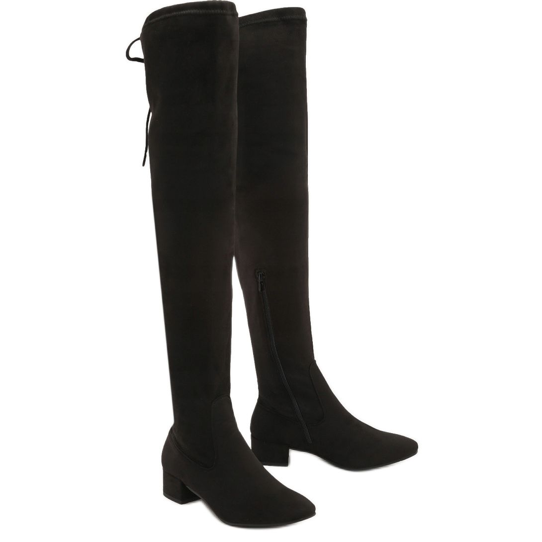 Die schwarzen Stiefel Vices T113-1 sind die perfekte Wahl für Frauen, die Wert auf Eleganz und Komfort legen. Diese einzigartigen Overknee-Musketiere aus Öko-Wildleder in tiefschwarzer Farbe passen perfekt zu den neuesten Modetrends. Dank des niedrigen Absatzes von 5 cm Höhe gewährleisten diese Schuhe ein angenehmes Tragegefühl den ganzen Tag, auch für Frauen, die lieber auf hohe Absätze verzichten.