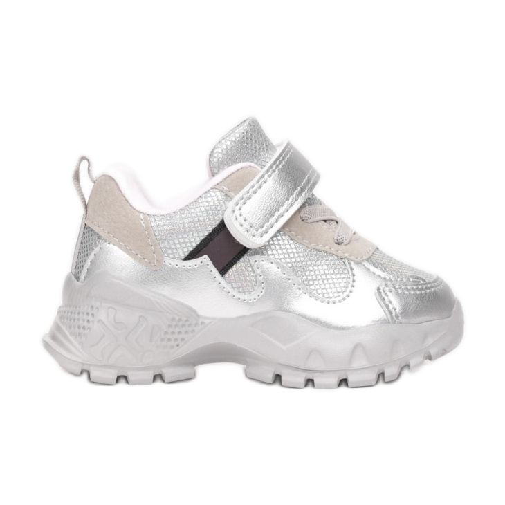 Die Sportschuhe Vices T7890-52 in Silber sind die perfekte Wahl für kleine Mädchen, die sowohl Wert auf Stil als auch auf Komfort legen. Diese modernen Sneaker stehen auf einer flachen, dicken Sohle, deren Seiten mit eleganten Rillen verziert sind. Die stabilisierende Lauffläche auf der Unterseite sorgt für hervorragenden Halt und macht sie zu einer idealen Wahl für alltägliche Spiele und Aktivitäten.