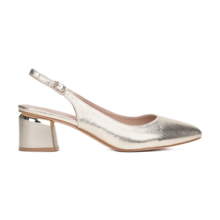 Der 5 cm hohe Blockabsatz, verziert mit einem stilvollen Metalleinsatz, sorgt für Tragekomfort und macht sie sowohl für den Alltag als auch für formellere Anlässe perfekt. Die mit einer Schnalle an einem dünnen Riemen befestigten Pumps betonen die Beine perfekt und die Innensohle aus Naturleder garantiert Komfort auch bei längerem Tragen.