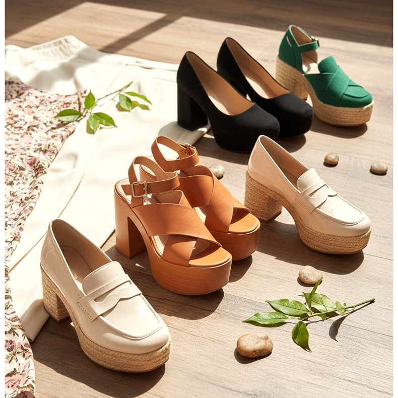 Die Farben der Plattformen für das Frühjahr 2026 sind überwiegend Naturtöne – Beige, Karamellbraun und zarte Rosatöne. Allerdings gibt es jede Menge Akzente in Form von kräftigem Grün oder klassischem Schwarz, das zu allem passt.