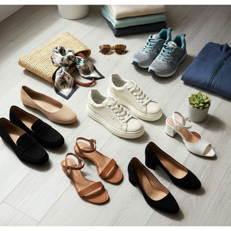 Zunächst einmal – universelle Sneaker in neutraler Farbe. Weiße oder cremefarbene Modelle eignen sich sowohl für den Alltag als auch für ein elegantes Casual-Styling. Zweitens – elegante Ballerinas oder Slipper für das Büro und formelle Anlässe. Beige oder schwarze Farben sorgen für maximale Vielseitigkeit.
