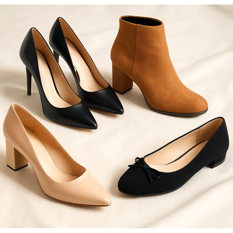 Klassische Pumps mit mittelhohem Absatz sind die universellsten formellen Schuhe für Damen. Schwarze oder beige Pumps passen zu nahezu jedem eleganten Styling. Durch die geschlossene Spitze und Ferse eignen sie sich selbst für die konservativsten Umgebungen. Der Blockabsatz sorgt für Stabilität bei langen Veranstaltungen. Perfekt für das Büro, Vorstellungsgespräche und offizielle Meetings.