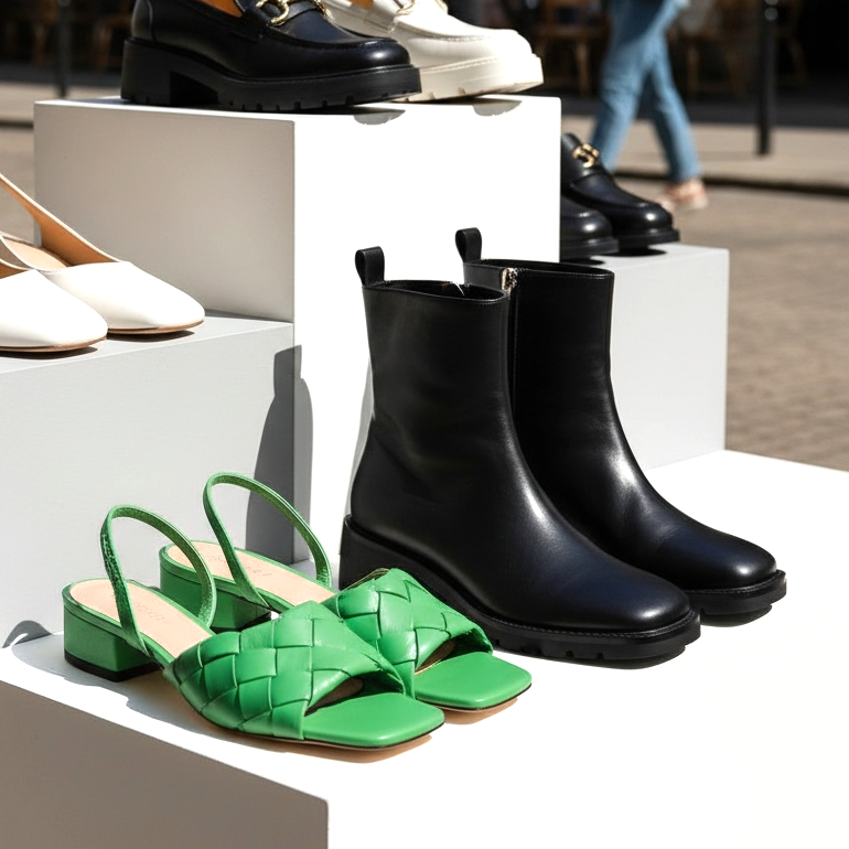 Im Jahr 2026 kehrte die quadratische Zehenpartie erneut zurück, dieses Mal jedoch in zwei unterschiedlichen Variationen. Der erste ist ein stark geometrischer, fast senkrechter Zehenkeil – gewagt, kunstvoll, präsentiert von Modehäusern wie Bottega Veneta. Die zweite Variante ist eine zartere Abrundung der Nasenwinkel – immer noch deutlich quadratisch, aber nicht so einschränkend. Beide Versionen entsprechen perfekt der zeitgenössischen Mode für Präzision und Architektur in der Kleidung.