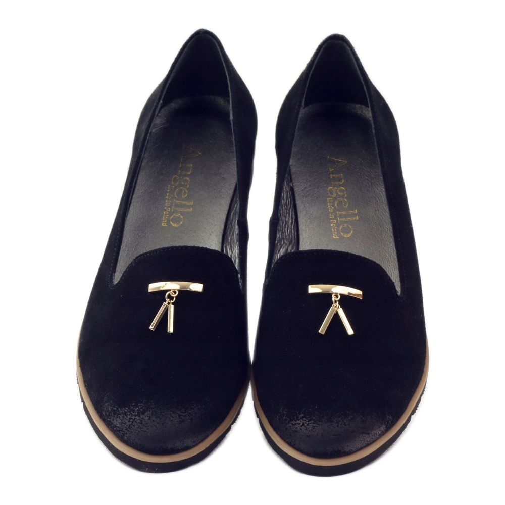 Stilvolle Schuhe der polnischen Marke Angello, Modell 1346, komplett aus natürlichem Wildleder in klassischer schwarzer Farbe mit goldener Verzierung. Perfekt für Frauen, die Wert auf eine Kombination aus Eleganz und Komfort legen.
