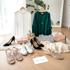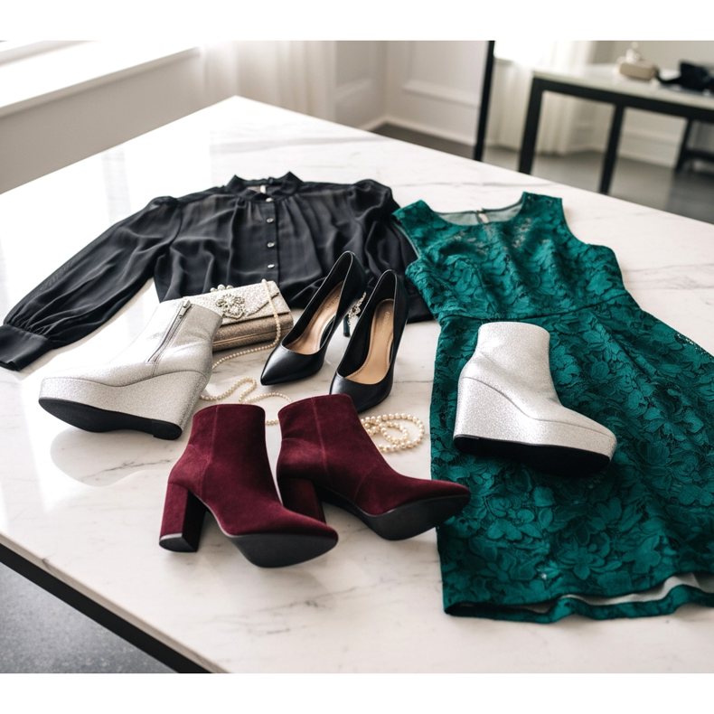 Schuhe für eine Bluse und ein Kleid für eine Party
