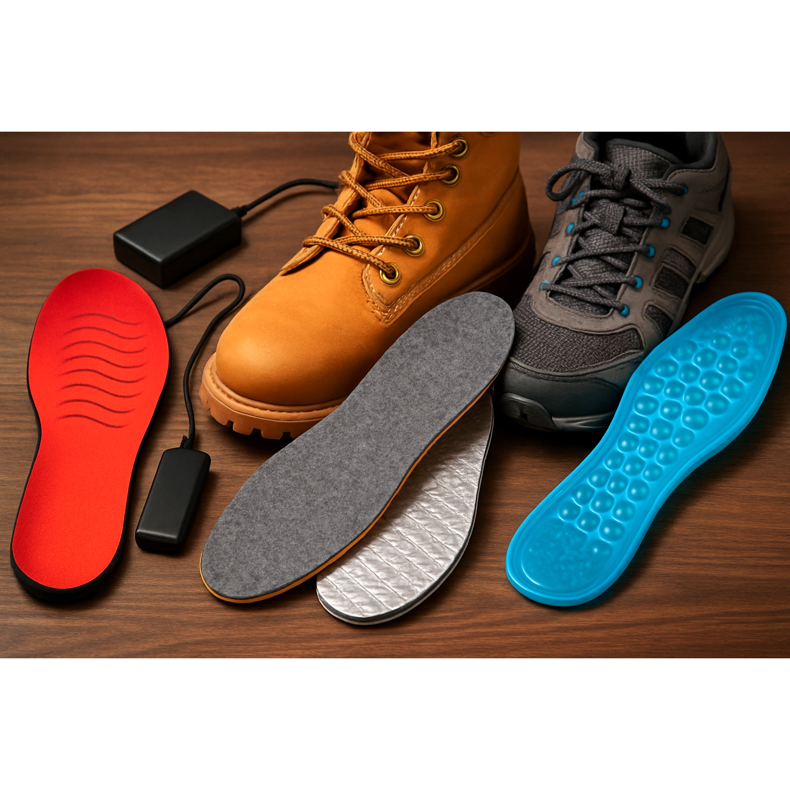 Beheizte Einlegesohlen, die über einen Akku betrieben oder über USB aufgeladen werden, halten Ihre Füße bei Frost warm. Sie bieten verschiedene Heizstufen (normalerweise 3-5 Stufen) und eine Betriebszeit von 4 bis 10 Stunden. Perfekt für Outdoor-Aktivitäten, Kaltarbeit und Wintersport. Wärmeisolierende Einsätze aus Materialien wie Wolle, Thinsulate, Aluminium reflektieren die Körperwärme und speichern die Wärme passiv. Leichter, günstiger, erfordert kein Aufladen. Ideal für Winter-Trekkingschuhe und Arbeitsstiefel. Kühlende Einlegesohlen mit kühlendem Gel sorgen für Linderung an heißen Tagen, reduzieren das Schwitzen und verhindern eine Überhitzung der Füße. Im Kühlschrank reaktiviert. Perfekt für Kuriere und Bauarbeiter im Sommer.