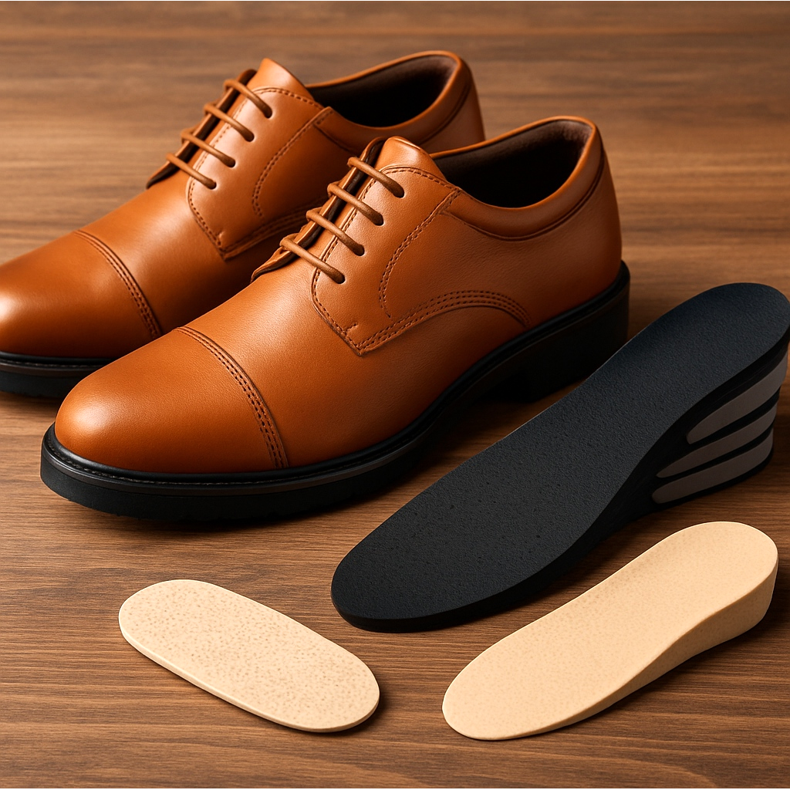 Erhöhte Einlegesohlen erhöhen die Höhe diskret um 2 bis 7 cm, versteckt im Inneren des Schuhs. Aus leichtem Mehrschichtschaum oder Silikon. Besonders beliebt in Asien, zunehmend akzeptiert in Europa. Es ist wichtig, ergonomische Modelle mit ausreichender Unterstützung des Fußgewölbes zu wählen, um Beschwerden zu vermeiden. Korrigierende Ferseneinsätze zur Korrektur von Beinlängendifferenzen, erhältlich in verschiedenen Höhen (von 3 mm bis mehrere cm). Sie helfen dabei, die Hüften auszurichten und Rückenschmerzen zu reduzieren. Insbesondere bei größeren Längenunterschieden sollte die Auswahl durch einen Orthopäden oder Physiotherapeuten erfolgen.