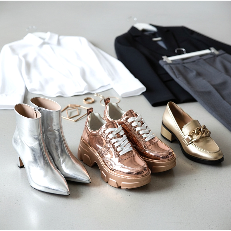 Wenn Sie mutig sind, sind Metallic-Braun, Silber oder Gold die Farben, die im Frühjahr 2026 der Renner sein werden. Sie erfreuen sich vor allem in Premium-Kollektionen und an kreativeren Arbeitsplätzen großer Beliebtheit. Tragen Sie metallische Schuhe zu neutralen Outfits – Schwarz, Weiß, Grau – damit nicht zu viel auf einmal aufblitzt. Abends können metallische Sneakers oder Stiefel eine tolle Ergänzung zu einem eleganten Styling sein. Tagsüber sehen Metallic-Plateauschuhe oder Sneakers modern und modisch aus, besonders wenn Sie sie mit minimalistischer Kleidung kombinieren.