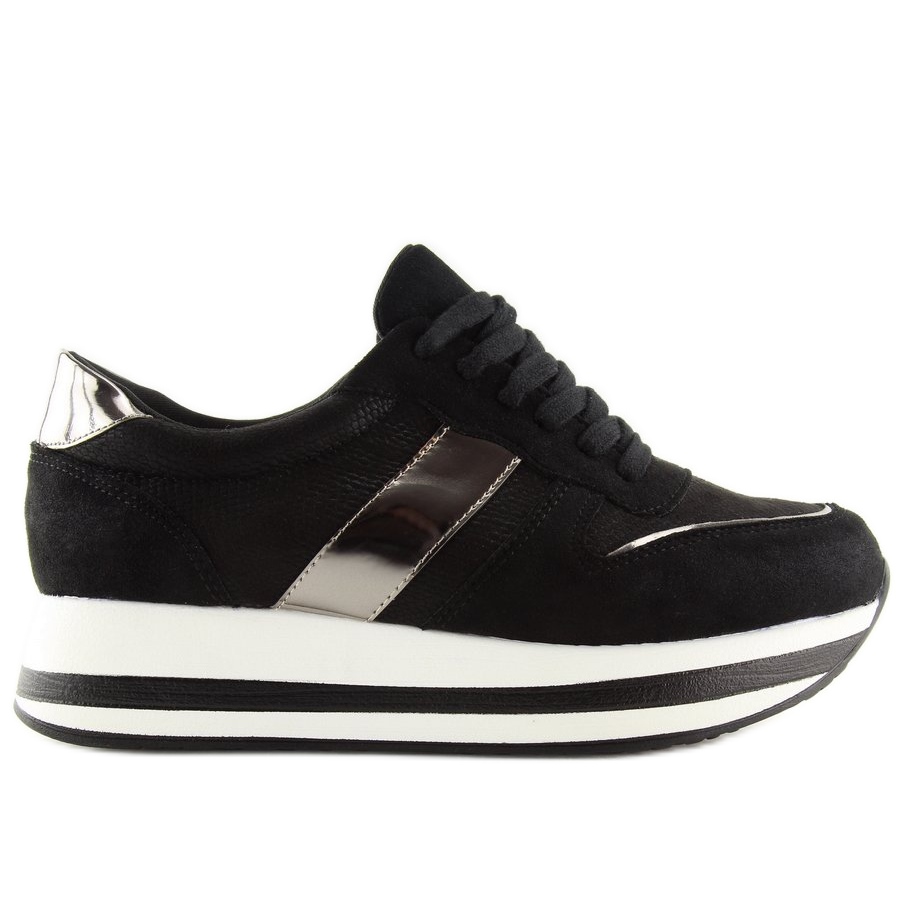 Schwarze Schuhe mit hohen Sohlen 99-11 Black sind die perfekte Wahl für moderne und stilvolle Frauen, die Komfort mit einem modischen Look verbinden möchten. Diese superleichten Sportschuhe zeichnen sich durch metallische Einsätze und dezente Prägungen aus, die ihnen einen eleganten Charakter verleihen. Dank der modischen hohen Sohle, die die Höhe um 4 cm erhöht, wird jedes Styling noch attraktiver.