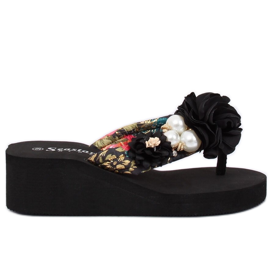 Wir präsentieren die schwarzen zehenstegsandalen CK93P Black mit Schaumstoffsohle, perfekt für moderne Frauen, die Wert auf Komfort und Stil legen. Diese bezaubernden zehenstegsandalen mit einer Keilhöhe von 5 cm vereinen Eleganz und Funktionalität. Sie bestehen aus Stoff und zeichnen sich durch dekorative Blumen und Perlen aus, die ihnen einen einzigartigen Charakter verleihen.