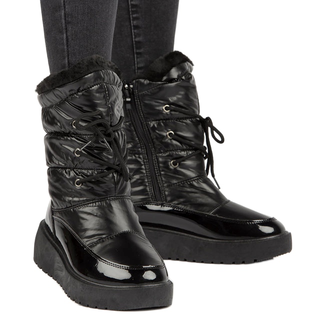 Ihr flacher 4,5 cm hoher Absatz und das sportliche Obermaterial garantieren Komfort und Stabilität beim Tragen. Diese mit Reißverschluss und Schnürsenkeln zu schließenden Schneestiefel fallen durch ihren modernen Stil auf und passen durch ihre universelle schwarze Farbe zu jedem Winter-Styling.