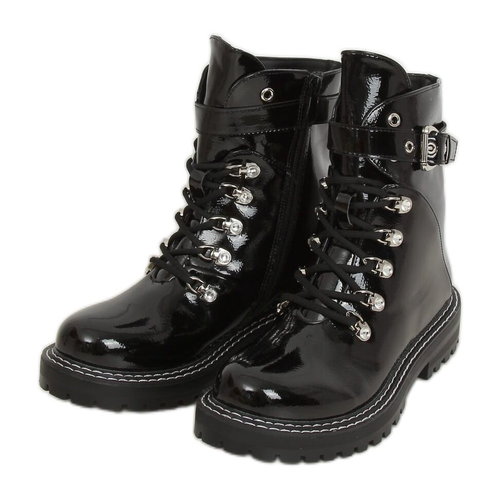 Lernen Sie die schwarzen Lackstiefel 8120-PA Black für Damen kennen – ein ideales Angebot für Modeliebhaber, die sich von der Masse abheben möchten! Diese Schnürstiefeletten sind eine Kombination aus Eleganz und Extravaganz und verleihen durch die glänzenden Steinchen an den Schlaufen einen einzigartigen Charakter. Die lackierte Oberfläche macht sie nicht nur attraktiv, sondern auch praktisch, perfekt für alltägliche Ausflüge.