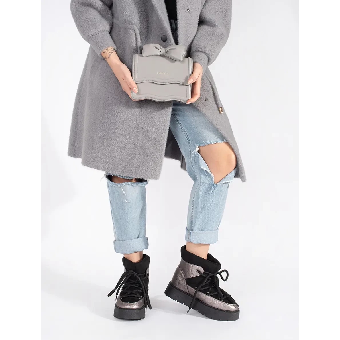 Entdecken Sie einen einzigartigen Komfort und Stil, der schwarze und silberne Schnürschnee-Stiefel auf eine dicke Sohle bringt. Diese modischen Schuhe, die von einer seriösen Marke produziert werden, sind die perfekte Lösung für kalte Tage in der Herbst- und Wintersaison. Sie bestehen aus Bio -Leder mit einem textilen Interieur und bieten einen hervorragenden Schutz vor Kälte und kümmern sich beim Tragen um den Komfort.