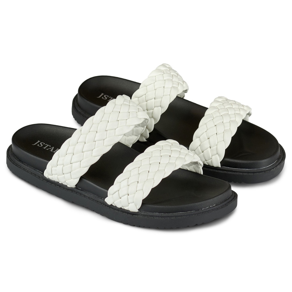Ihr minimalistisches Design in klassischem Weiß mit schwarzen Elementen verleiht ihnen einen einzigartigen Charakter, sodass sie sowohl zu Sommerkleidern als auch zu Freizeithosen passen. Ein flacher 2,0 cm hoher Absatz sorgt für Tragekomfort und die offene Spitze lässt Ihre Füße an warmen Tagen frei atmen.