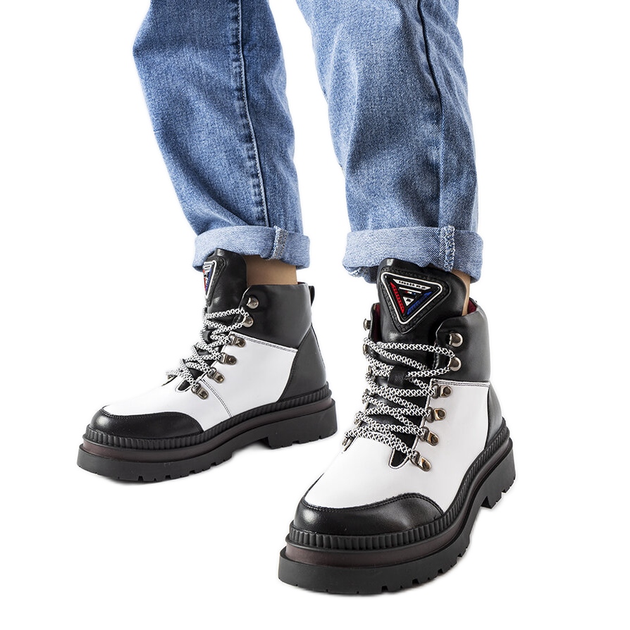 Stylish, isoliertes Frauenwandern in der kontrastierenden Version von Schwarz/Weiß. Die Kombination aus schwarzem ökologischem Leder mit weißen Akzenten, gepolstert mit einem weichen Schaffellmantel - perfekt für kühlere Tage, wenn Sie sich für ein warmes und modisches Aussehen interessieren.