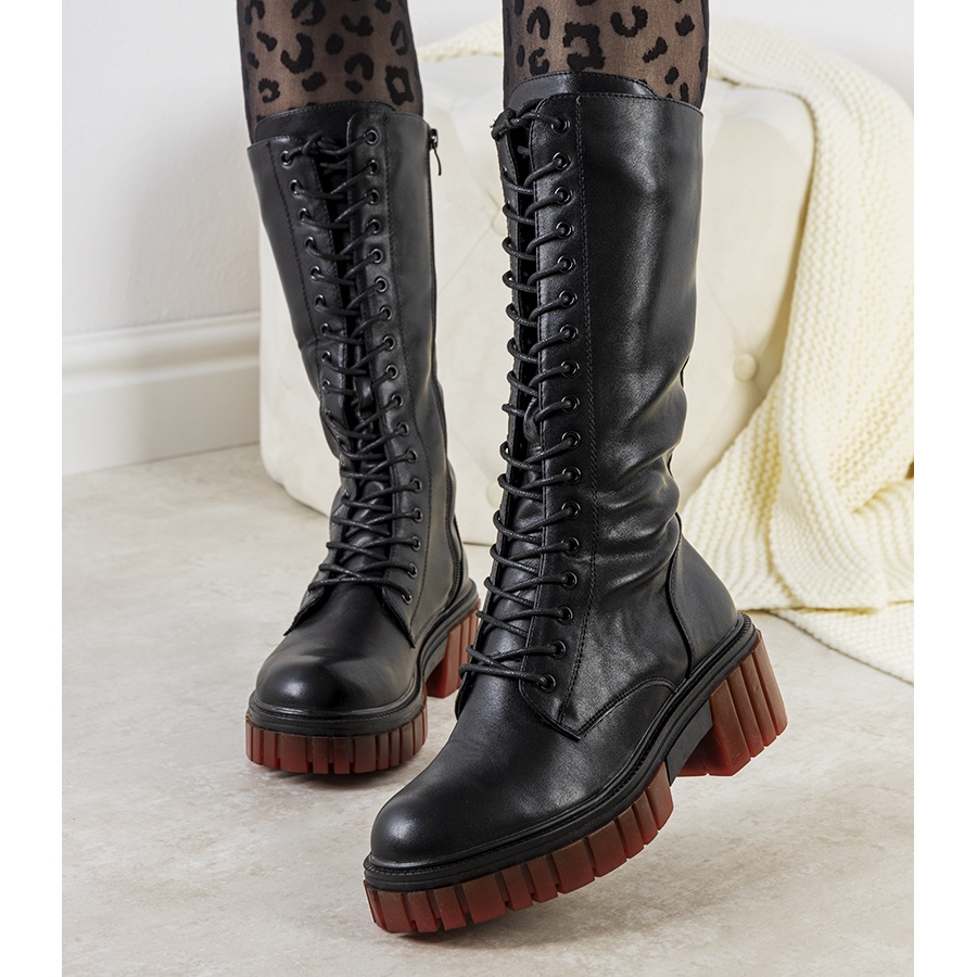 Wir präsentieren außergewöhnliche schwarze Abril-Stiefel, die durch Stil und Funktionalität begeistern. Dank des speziellen Obermaterials passen sie sich perfekt dem Bein an, betonen dessen Silhouette und verleihen jedem Styling einen einzigartigen Charakter.