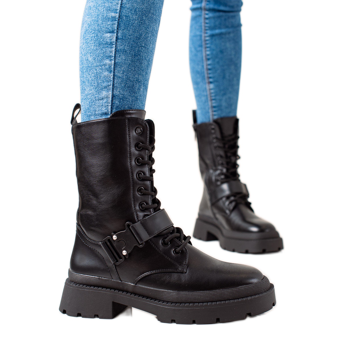 Diese hohen Stiefel bestehen aus ökologischem Leder, was sie nicht nur ästhetisch, sondern auch umweltfreundlich macht. Das schwarze Finish verleiht Eleganz und die dekorative Schnalle unterstreicht ihren einzigartigen Charakter. Der Innenraum ist mit Textilmaterial gefüttert, was ein angenehmes Tragegefühl den ganzen Tag über gewährleistet, und die Winterisolierung hält Ihre Füße auch an den kältesten Tagen warm.