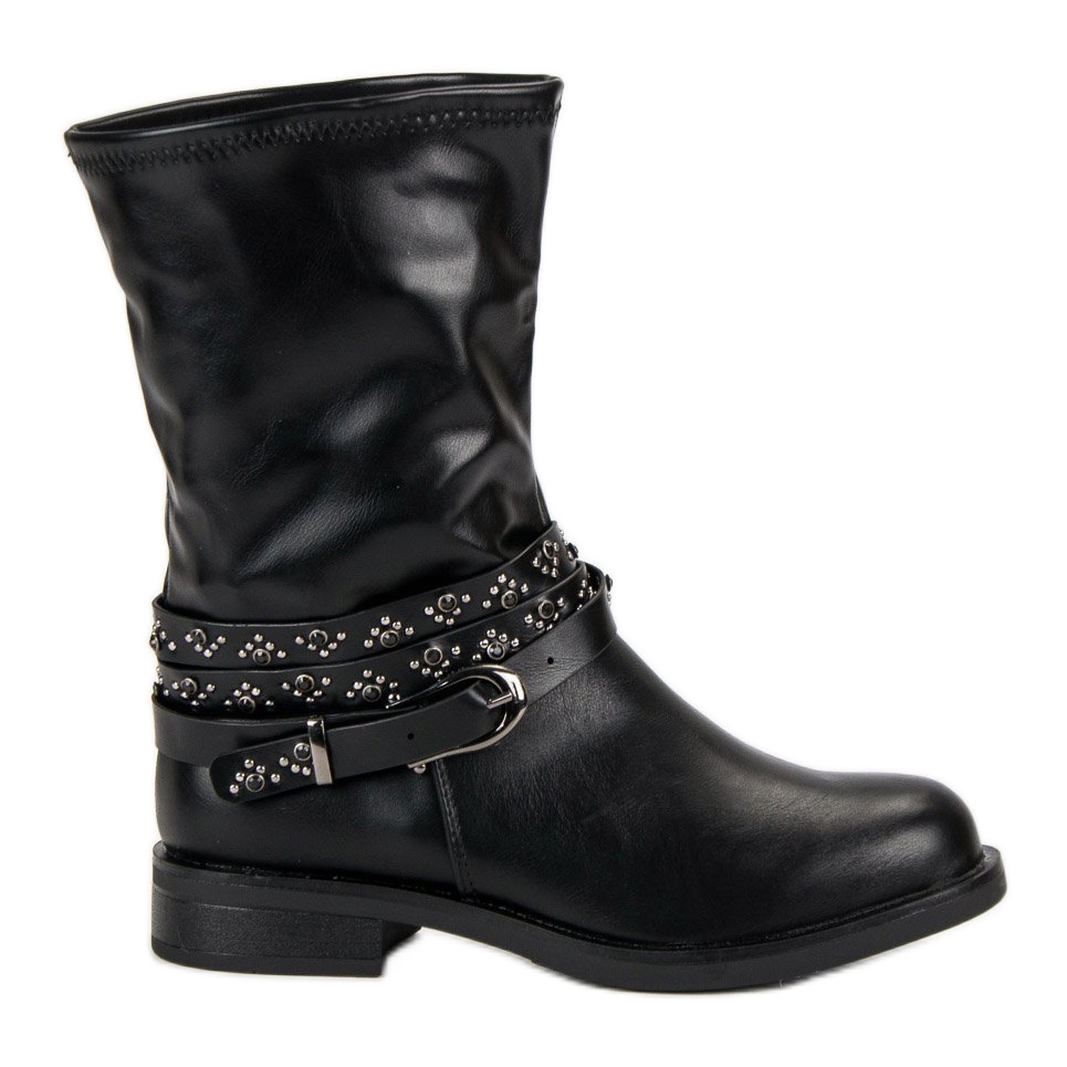Schwarze Arbeiterstiefel sind ein universelles Accessoire, das sowohl zu legeren als auch zu eleganteren Styles perfekt passt. Verziert mit dekorativen Streifen mit Strasssteinen und einer markanten Schnalle ziehen sie die Blicke auf sich und verleihen jedem Styling einen einzigartigen Charakter.