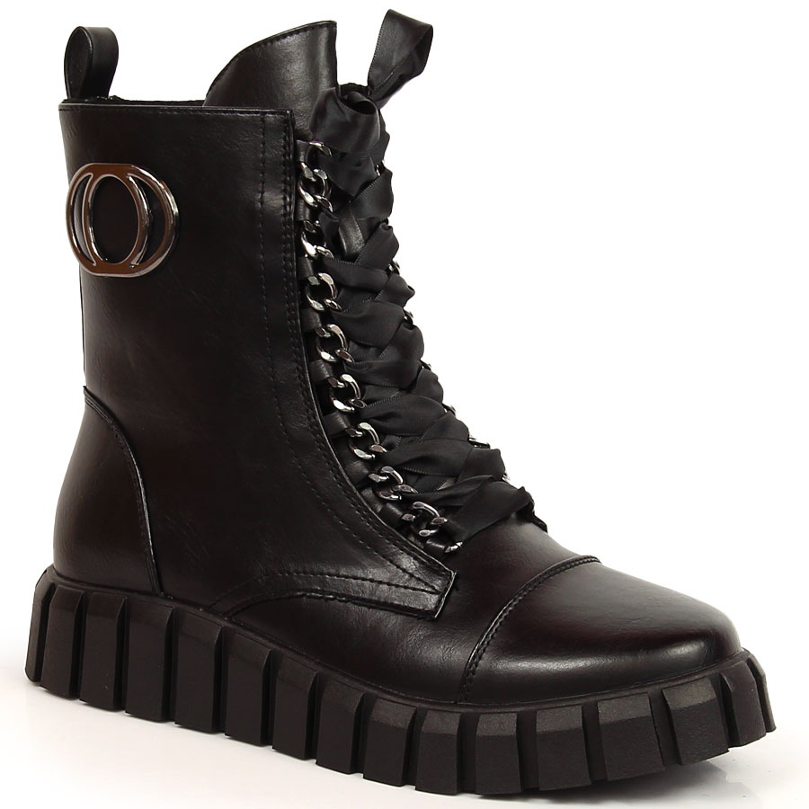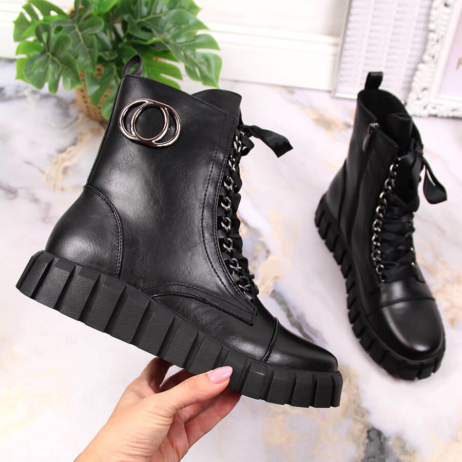 Dieses Modell zeichnet sich durch eine klassische, runde Spitze und einen praktischen Reißverschluss und Schnürverschluss aus, der das Anziehen und Anpassen an den Fuß erleichtert. Dank ihrer universellen schwarzen Farbe passen sie perfekt zu verschiedenen Stilen – von lässigen Jeans bis hin zu eleganten Kleidern.