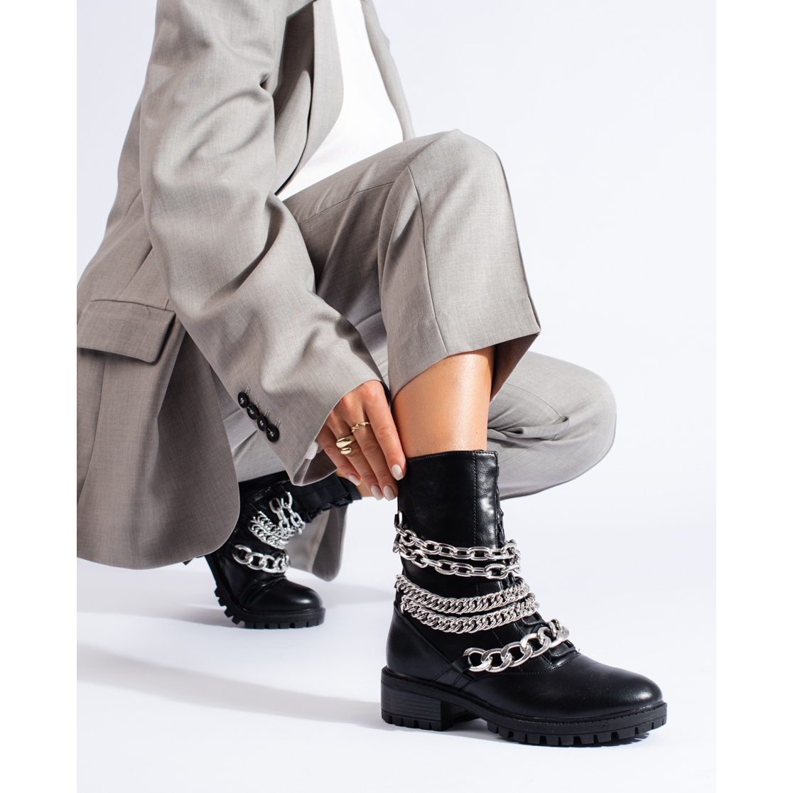 Details: Schwarze Arbeiterstiefel für Damen mit einer Shelovet-Kette
