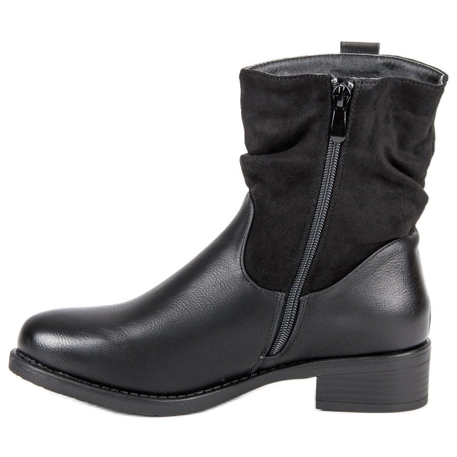 Entdecken Sie einzigartige schwarze Arbeitsstiefel, die zu einem unersetzlichen Bestandteil der Garderobe jeder Frau werden. Diese stylischen Schuhe sind die perfekte Kombination aus klassischem Stil und rockigen Akzenten, die heutzutage angesagt sind. Sie wurden mit außergewöhnlicher Liebe zum Detail gefertigt und zeichnen sich durch eine interessante Materialkombination aus – ein Obermaterial aus ökologischem Wildleder in einem anderen Schwarzton, das mit elegantem ökologischem Leder verflochten ist, was ihnen einen einzigartigen Charakter verleiht.