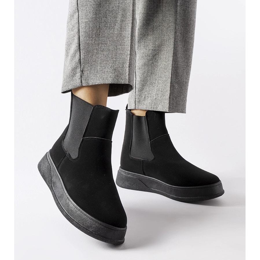 Moderne Slip -up -Stiefel auf einer flachen Plattform Benilde ist ein Vorschlag für Frauen, die Komfort und modisches Erscheinungsbild schätzen. Sie bestehen aus ökologischem Leder aus Wildleder, isoliert und mit einer Feuchtigkeitsbeständigkeit mit Gummi, die in der Herbst -Village -Saison arbeiten. Die runde Nase bietet Komfort und die klassischen schwarzen Farben passen zu vielen Stilen.