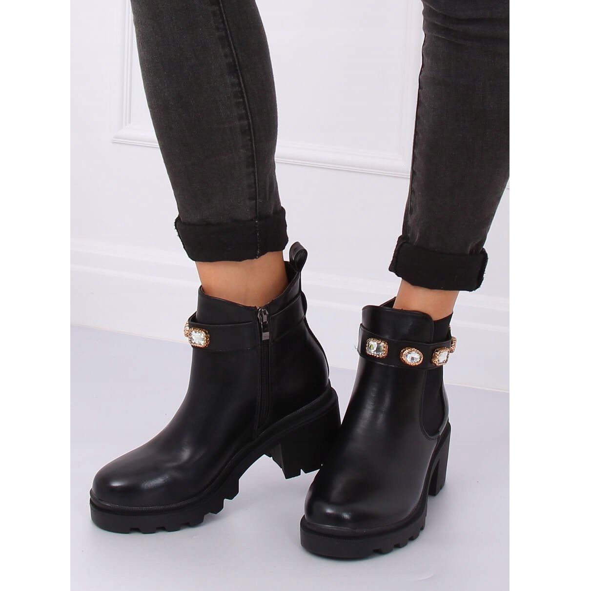 Dieses Modell zeichnet sich durch beeindruckende Strasssteine in einem goldenen Rahmen aus, die ihm einen einzigartigen Charakter verleihen und jedes Styling zum Strahlen bringen. Der elastische Einsatz an der Seite und der Reißverschluss sind praktische Lösungen, die das Anziehen der Schuhe erleichtern und gleichzeitig für eine perfekte Passform sorgen.