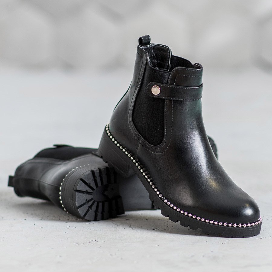 Ein stilvoller breiter Absatz mit einer Höhe von 3,5 cm sorgt für Stabilität und verleiht gleichzeitig einen dezenten mädchenhaften Charme. Ein Zierstreifen mit Strasssteinen und Perlen entlang der Sohle verleiht den Chelsea-Boots einen einzigartigen Charakter, der Aufmerksamkeit erregt und jedes Styling ergänzt.