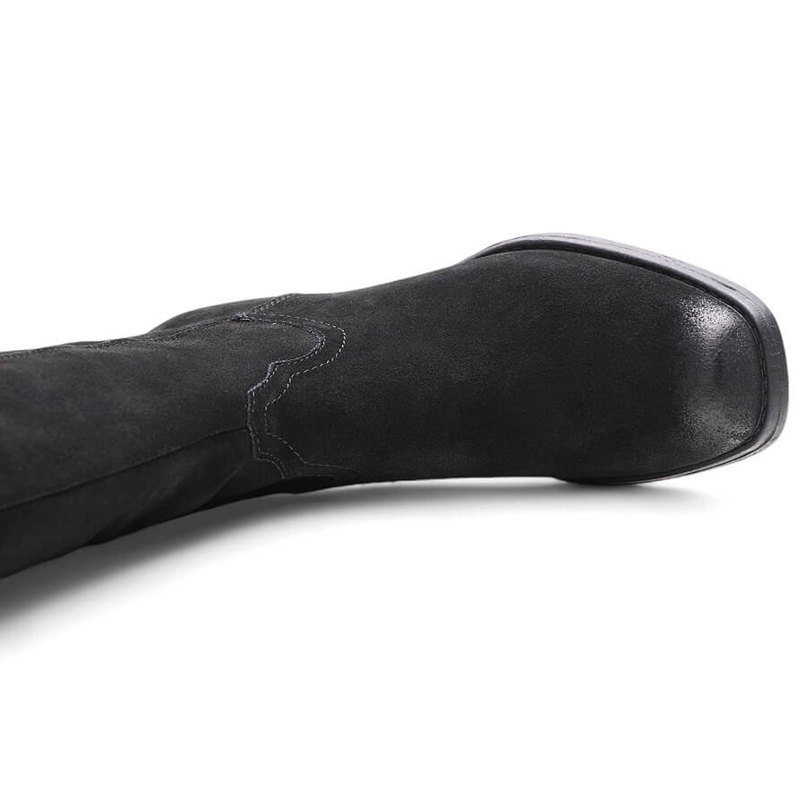 Die Höhe des oberen von etwa 37 cm bedeutet, dass die Stiefel bis zum Knie reichen und eine flache Ferse mit einer Höhe von 4 cm bei den täglichen Aktivitäten Komfort bietet. Die runde Nase verleiht ihnen einen klassischen Charakter, und die universelle schwarze Farbe macht sie perfekt mit verschiedenen Stilisierungen - sowohl in lässigen als auch in eleganteren Versionen.