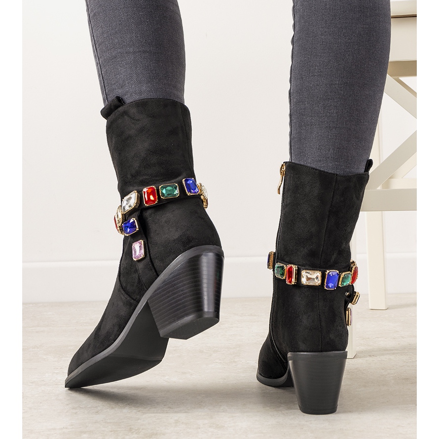 Das sind schwarze Cowboystiefel, verziert mit bunten Mabella-Steinen – ein absoluter Hit in diesem Herbst! Diese stilvollen Stiefel begeistern durch ihr einzigartiges Design und die hohe Verarbeitungsqualität, die den ganzen Tag über Tragekomfort gewährleistet. Diese Cowboystiefel aus Wildleder-Ökoleder vereinen Eleganz mit einem modischen Look.