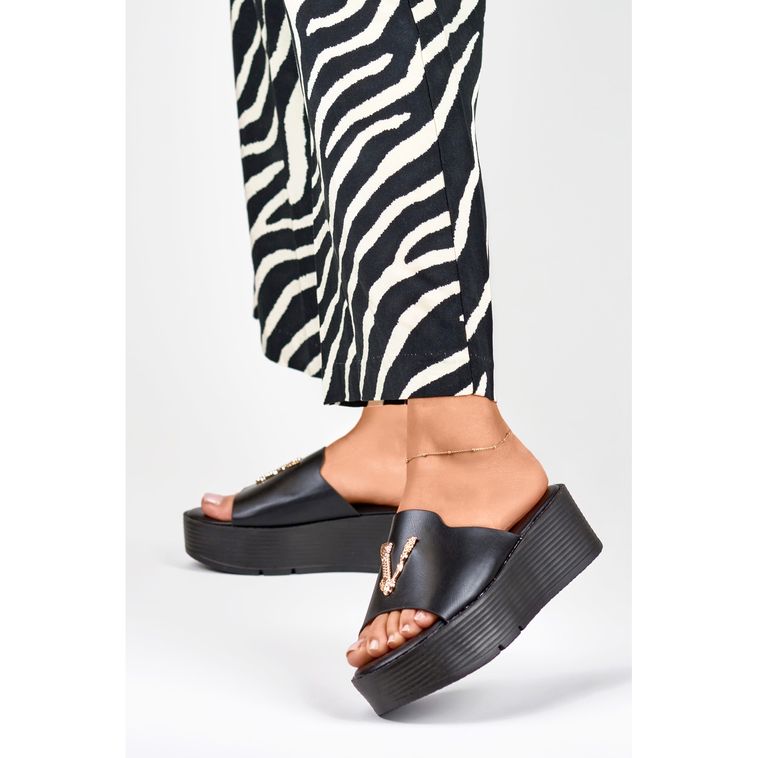 Details: Schwarze Damen-Keilsandalen mit Goldverzierung