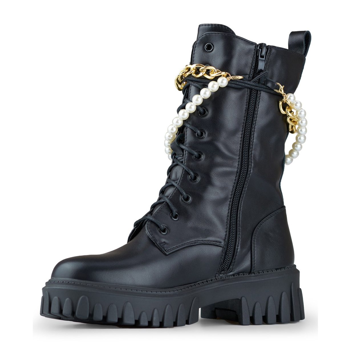 Moderne, zeitlose schwarze Arbeiter aus ökologischem Leder. Die Kombination aus Rockcharakter (Strasssteine, Kette) mit praktischen Lösungen - das Schloss und die Schnürung sorgen für eine schnelle Anpassung und perfekte Passform, und die abnehmbare Dekoration bietet die Möglichkeit, das Aussehen schnell zu ändern. Durch das isolierte Innenraum arbeiten die Schuhe während der Herbst/Winter -Saison.