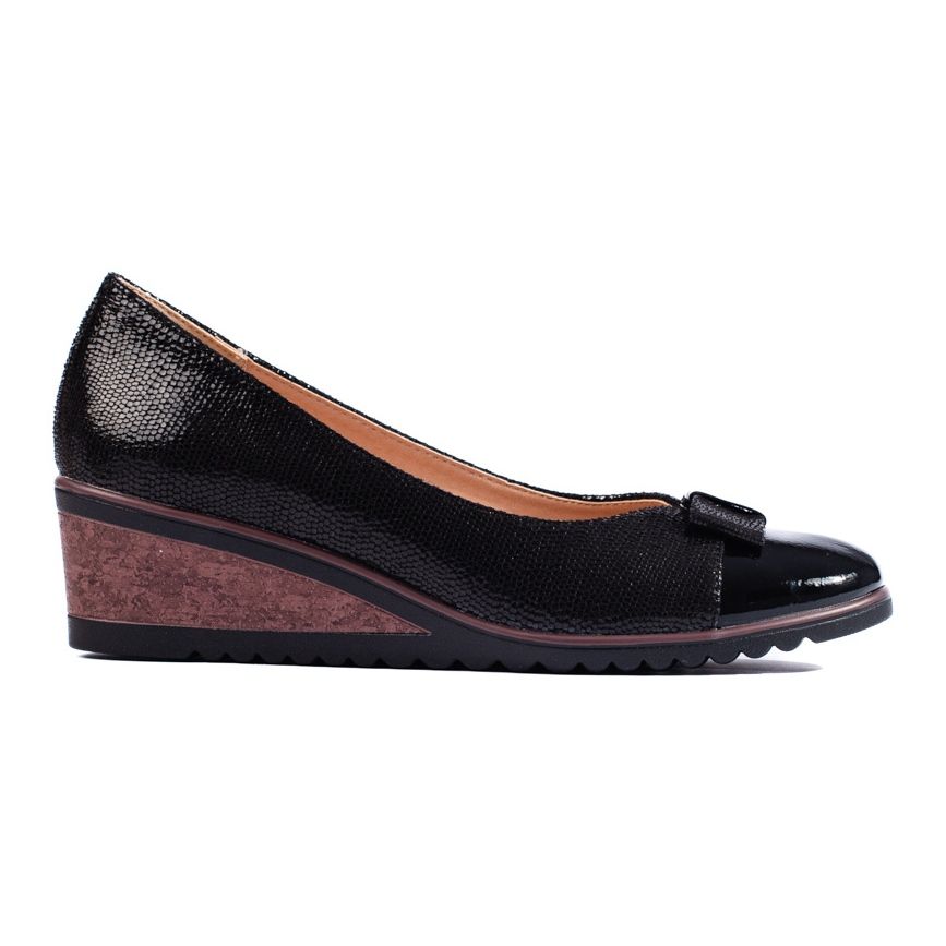W. Potocki -Pumpen sind eine Kombination aus klassischer Eleganz und Komfort - der niedrige Keil sorgt für die Stabilität, und das lackierte Finish und das subtile Tiermuster verleihen Charakter. Eine ausgezeichnete Wahl für Menschen, die universelle, stilvolle Schuhe für verschiedene Gelegenheiten suchen.