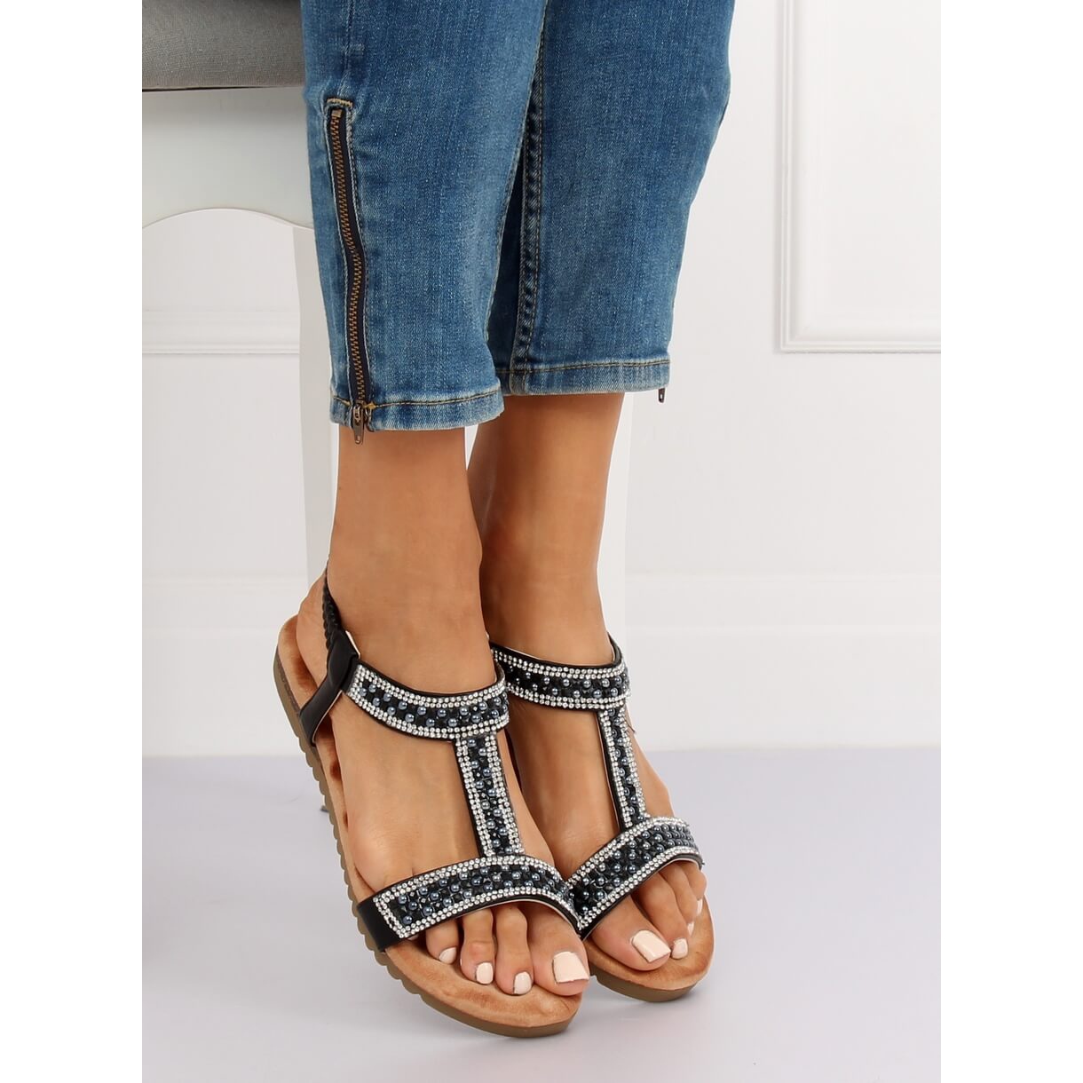 Diese äußerst stylischen Schuhe verfügen über dezente, dünne Riemchen, die die weibliche Figur perfekt betonen. Ein zusätzlicher Vorteil sind Verzierungen in Form von Strasssteinen, die ihnen einen einzigartigen Charakter verleihen. Darüber hinaus sind sie durch den 2 cm hohen flachen Absatz die perfekte Sandale für den Alltag und sorgen für Bewegungsfreiheit und Komfort.