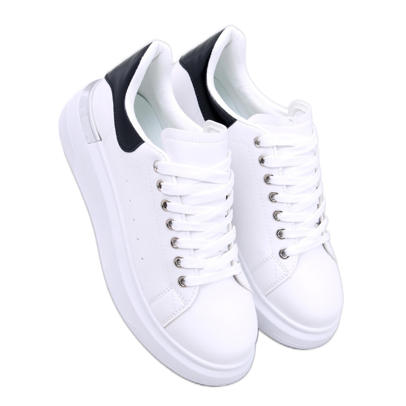 Dank der hohen Sohle mit einer Höhe von 5 cm fügen Turnschuhe nicht nur Zentimeter hinzu, sondern bieten bei jedem Schritt auch Komfort. Eine runde Nase und ein minimalistisches Design in einer klassischen Kombination von Weiß mit schwarzen Details machen diese Schuhe perfekt zu verschiedenen Stilen, von lässiger bis hin zu eleganter.