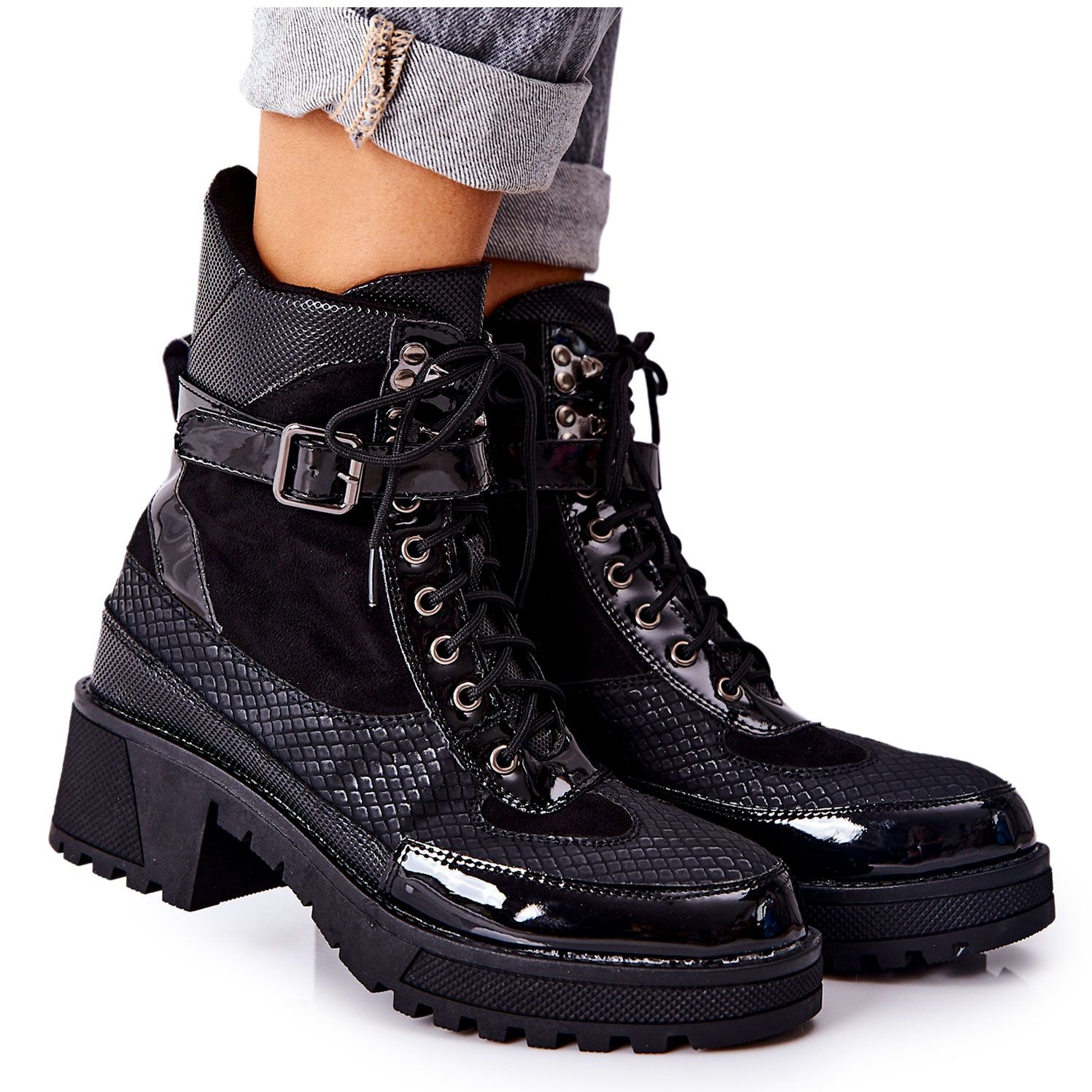 Die Stiefel zeichnen sich durch einen mit einer Schuhdecke isolierten Innenraum aus, der an kälteren Tagen für Wärme sorgt. Ein stabiler 5 cm hoher Absatz sorgt für Trittsicherheit und die flache Sohle erhöht den Tragekomfort. Der seitliche Reißverschluss und der Schnürverschluss wiederum machen das Anziehen der Schuhe zu einem echten Vergnügen. Die zusätzliche Befestigung durch einen verstellbaren Riemen mit Schnalle ist nicht nur funktional, sondern auch ein modischer Akzent, der das charakteristische Erscheinungsbild der Stiefel unterstreicht.
