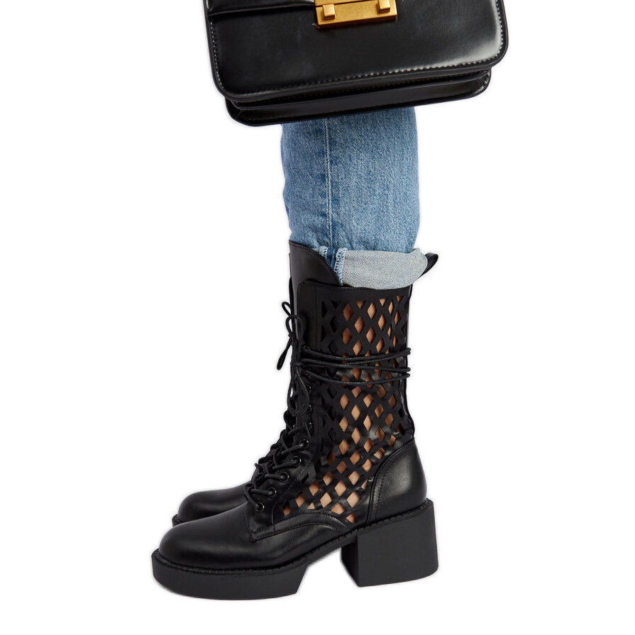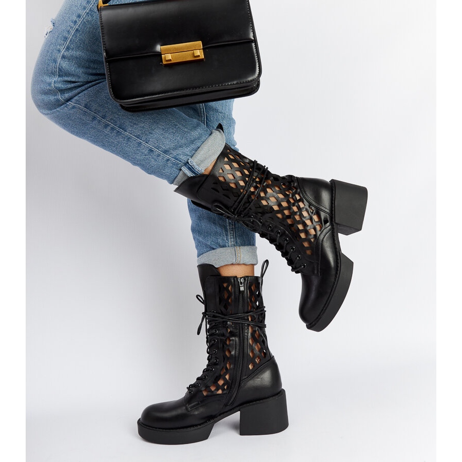 Details: Schwarze durchbrochene Visalia-Stiefel mit hohen Absätzen