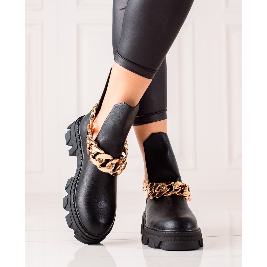 Die aus hochwertigem Lederimitat gefertigten Stiefel zeichnen sich durch einen strukturierten, weichen Absatz und eine runde Spitze aus, wodurch sie den ganzen Tag über angenehm zu tragen sind. Die am Obermaterial angebrachte Goldkette macht sie attraktiv und macht sie zu einem nicht allzu trivialen Element jedes Stylings.