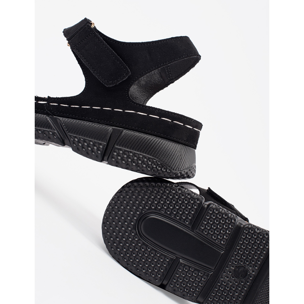 Diese Sandalen werden praktisch mit Klettverkleidung befestigt und erleichtert es, die Form des Fußes genau zu erreichen. Die klassische schwarze Farbe bedeutet, dass sie zu verschiedenen Outfits passt - von luftigen Kleidern bis hin zu lässigen Jeans.