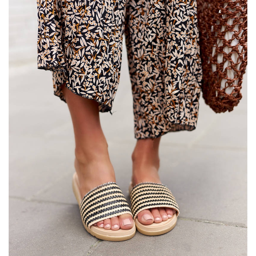 Das Modell zeichnet sich durch einen flachen 3 cm hohen Absatz aus, wodurch es nicht nur stilvoll, sondern auch den ganzen Tag über sehr angenehm zu tragen ist. Dank der einheitlichen Nummerierung können Sie sie ganz einfach an Ihre Größe anpassen. Ihr einzigartiges Streifenmuster verleiht Charakter und das Fehlen einer Zehenpartie sorgt für Bewegungsfreiheit und Belüftung, was besonders an wärmeren Tagen wertvoll ist.